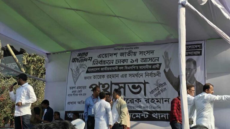 ঢাকা–১৭ আসনের ইসিবি চত্বরে একটি অস্থায়ী মঞ্চ প্রস্তুত করা হয়েছে, যেখানে বিএনপির নির্বাচনী প্রতীক ‘ধানের শীষ’র পক্ষে ভোট চাইতে তারেক রহমানের বক্তব্য দেওয়ার কথা রয়েছে।